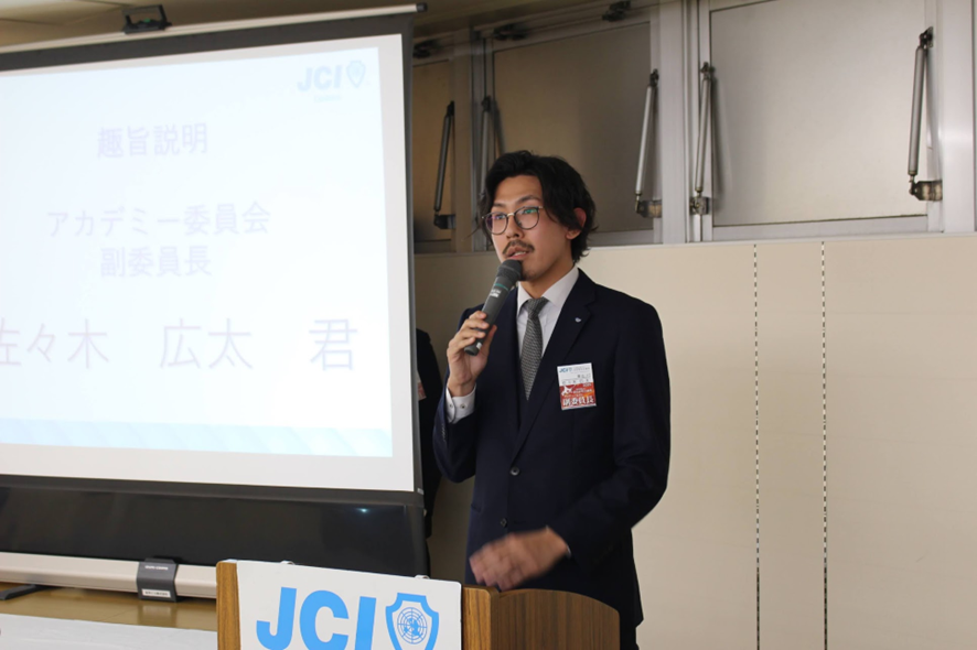 次に、アカデミー委員会 副委員長 佐々木 広太(ささき こうた)君から本オリエンテーションの趣旨説明として、「本オリエンテーションは、新入会員が青年会議所の理念や活動の意義を知り、不安を解消しながら次年度への一歩を安心して踏み出すための場であること、また講演を通じてJCでの学びを自身の成長や仕事にどう活かすのかを感じてほしい。」という想いが語られました。