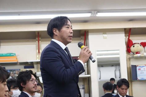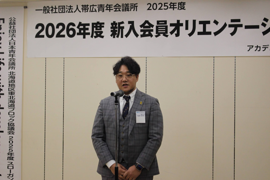 2026年度組織図の発表後、一般社団法人帯広青年会議所2026年度を牽引していく、理事長予定者 梶原 成悟(かじわら せいご)君が、新入会員予定者に向けて、「青年会議所は挑戦する人を全力で受け止める組織です。失敗を恐れず一歩踏み出し、仲間とともに学び、成長しながら、このとかち帯広の未来を共に創っていきましょう」と、エールを贈りました。