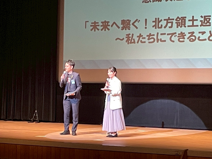 前説「未来へ繋ぐ!北方領土返還への一歩~私たちにできること~」では、一般社団法人帯広青年会議所から出向している、公益社団法人日本青年会議所 北海道地区協議会 国際関係委員会 委員長 津田 祥平(つだ しょうへい)君と、公益社団法人 千島歯舞諸島居住者連盟 元島民後継者 佐藤 光(さとう ひかる)氏より、北方領土返還要求運動を若い世代への教育や地域社会での啓発活動の重要性についてお話をいただきました。