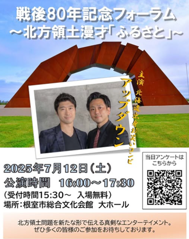 お笑いコンビ「アップダウン」による、北方領土漫才「ふるさと」では、歴史的・政治的に難しいテーマである北方領土問題について元島民の想いや故郷への願いをユーモアに乗せて伝えていただきました。
