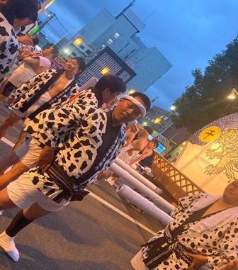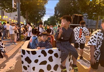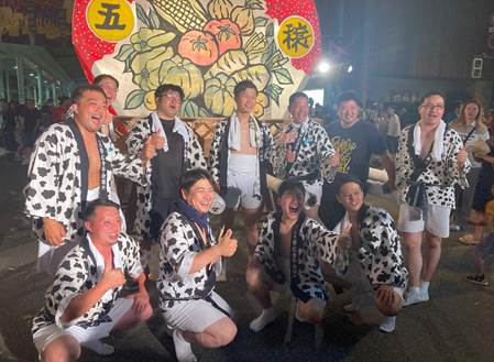 メンバーと子どもたちが一緒になって盆踊りを楽しみました。山車に乗った子どもたちが沿道へ手を振り、笑顔を届ける姿に、見ている人たちも思わず笑顔になっていました。