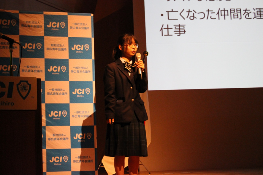 日本青年会議所が行う青少年育成事業「グローバルユース国連大使」の活動に参加した鹿追高校2年生 清水麻衣亜さんより「ドイツ現地学習と平和教育」についての発表がありました。