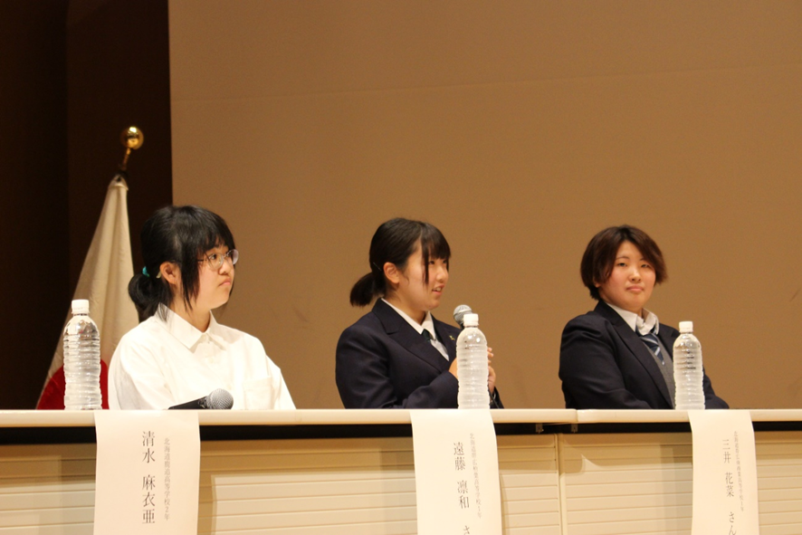 続いて、登壇した高校生と田中様によるトークセッションが行われました。 まず、「探究活動を通して自分はどう成長したか」という問いに対し、学生からは、課題を自ら発見し、仲間と意見を交わしながら考える力を養うことができたとの声がありました。
