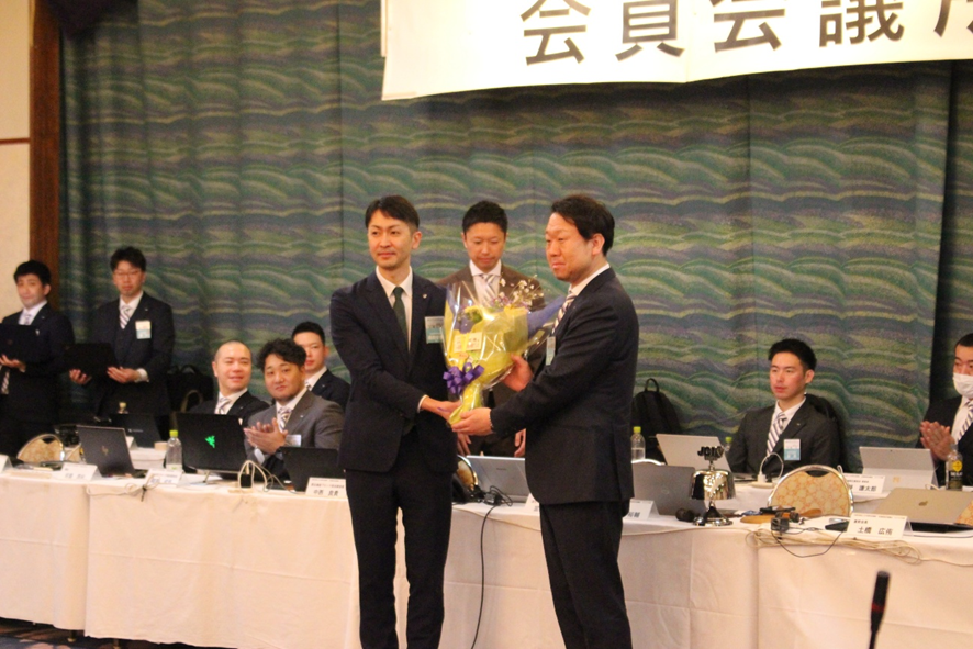 2025年度会長 鈴木 裕輔(すずき ゆうすけ)君から2024年度会長 土橋 広侑(つちはし ひろゆき)君へ、前年度の功績を称えると共に労をねぎらい、花束の贈呈が行われました。