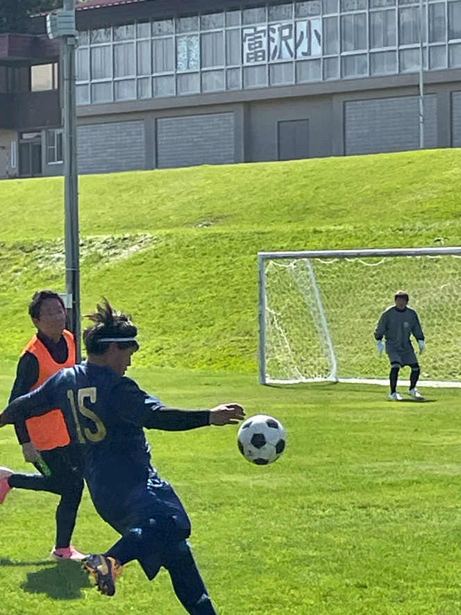 アカデミー委員会 委員 緑川 康太(みどりかわ こうた)君【青ユニフォーム15番】は、ディフェンスに囲まれながら華麗なボレーシュートを放ちます!