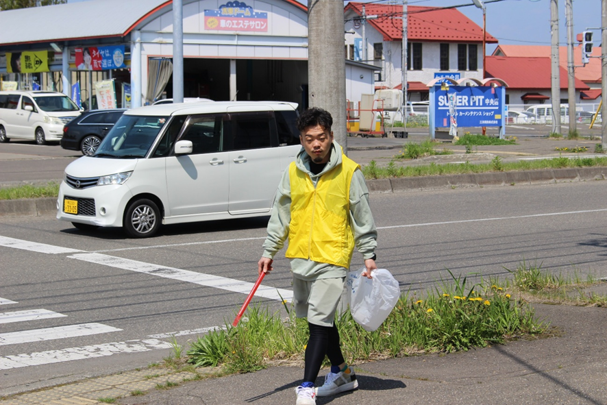 周囲の安全に気を配りながら、歩道だけでなく車道に落ちたゴミも拾っています!