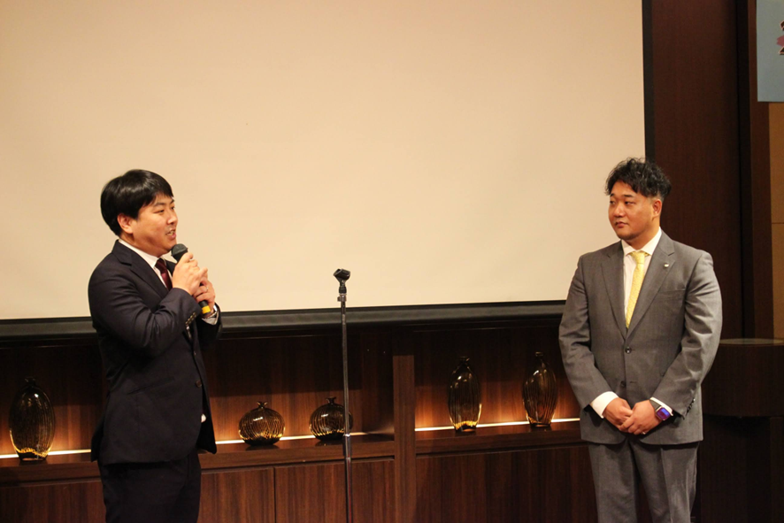緊張感が伝わってきましたが、祝賀会の司会進行という大役を務めていただきました!