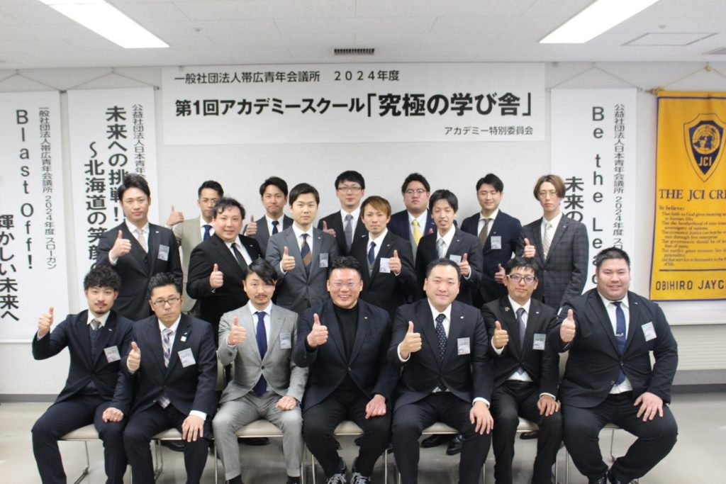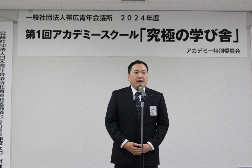 まず初めに、2024年度 理事長 加藤 貴裕(かとう たかひろ)君より「中島 土 先輩は帯広青年会議所との姉妹JCである、一般社団法人大分青年会議所のOBであります。私と中島 土 先輩との出会いは2022年度に開催されたサマーコンファレンスで初めてお会いし、帯広青年会議所が姉妹JC ということで、気さくに話かけていただいたことが嬉しかったことを今でも覚えています、またアカデミーメンバーの皆様におかれましては、今回の御講演は大変貴重な機会となりますので、今後の青年会議所活動の糧としてください。」とご挨拶をいただきました。