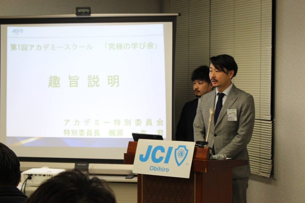 次にアカデミー特別委員会 特別委員長 梶原 一生(かじわら いっしょう)君より「今回のアカデミースクールは、青年会議所の存在意義と向上できる能力やリーダーに必要な要素を理解していただき今後の青年会議所の運動や活動に対しての理解を高める機会です。」と趣旨説明を行いました。