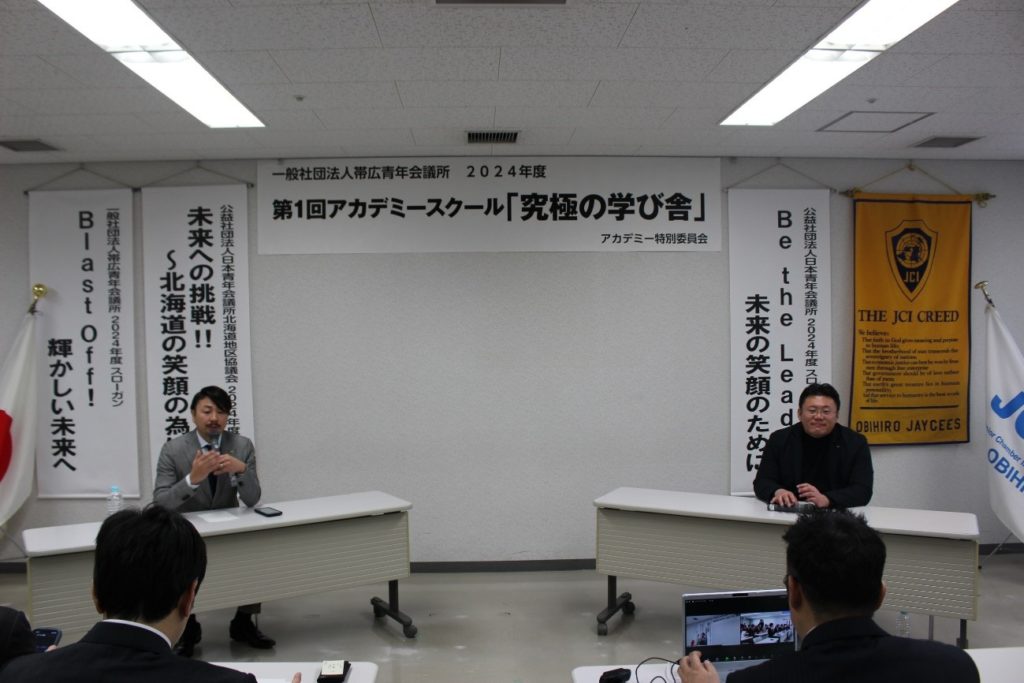 第2部では、中島 土 先輩【写真右側】と梶原 一生 君【写真左側】が青年会議所というプラットフォームを使ってどのような成長をしてきたかをディスカッションしていただき青年会議所の運動や活動を通じて得られる成長した自身の姿を想像していただきました。またトークセッションの中でアカデミーメンバーや他のメンバーからの質問を募り、リアルタイムでの質疑応答がありました!