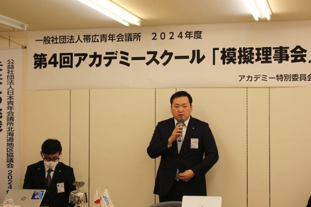 まず初めに、一般社団法人帯広青年会議所 アカデミー特別委員会※1 特別委員長 梶原 一生(かじわら いっしょう)君より「今日まで新入会員は将来的に一般社団法人帯広青年会議所の例会・事業で実際に開催してみたいという気概で、今日まで議案と向き合ってきましたので、本日も建設的なご質問を賜りたく存じます。また模擬理事会 審議編終了後に開催される模擬例会においても新入会員が本気で事業構築したものに対して、どのようにすることでとかち帯広のためになっていくのか。を考える時間としていただければ幸いでございます」と開催の趣旨説明がありました。