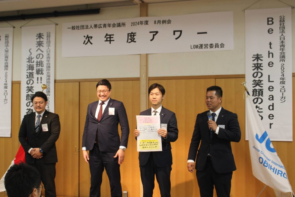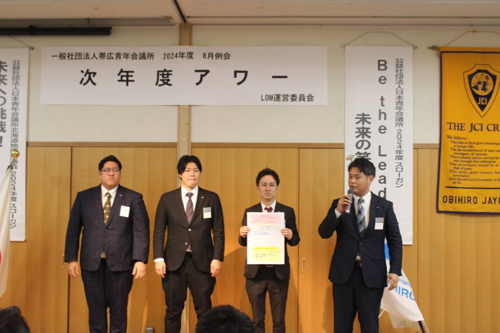 まず初めに、一般社団法人帯広青年会議所 2025年度理事長予定者 米澤 祥隆(よねざわ よしたか)君より緊張感のある雰囲気の中で「帯広青年会議所が今年度の想いを紡ぎ、次年度に繋げるために頑張ってまいりましょう」と熱い想いを述べました。私たちはこの基本方針に沿って運動や活動に邁進していきます!