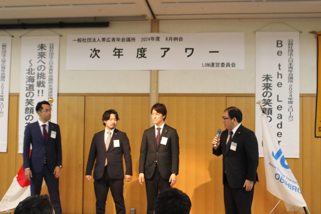 次に、副理事長予定者 三谷 佳祐(みたに けいすけ)君【写真中央】が担当する国際アカデミー誘致会議 議長予定者 西江 晴彦(にしえ はるひこ)君【写真左】ととかちムーンショット委員会 委員長予定者 川合 佑介(かわい ゆうすけ)君【写真右】です。