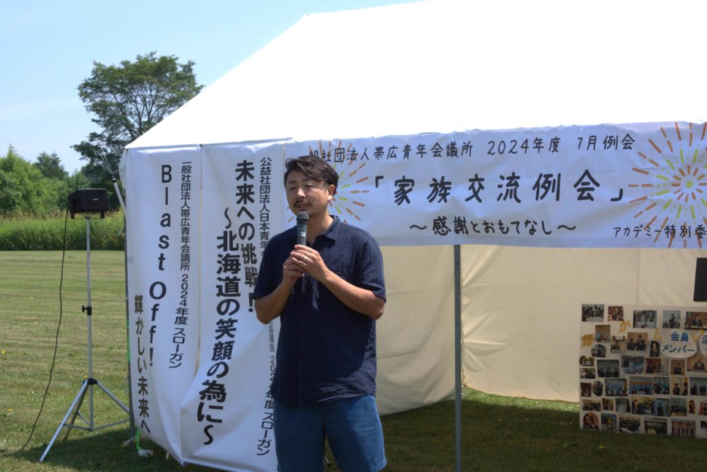 まず初めに、一般社団法人帯広青年会議所 理事長 加藤 貴裕(かとう たかひろ)君より「本日はお集まりいただきありがとうございます。日頃から青年会議所として活動できるのは支えてくださっているご家族のお力があってこそです。本日はどうぞごゆっくりお楽しみください」と挨拶をいただきました。