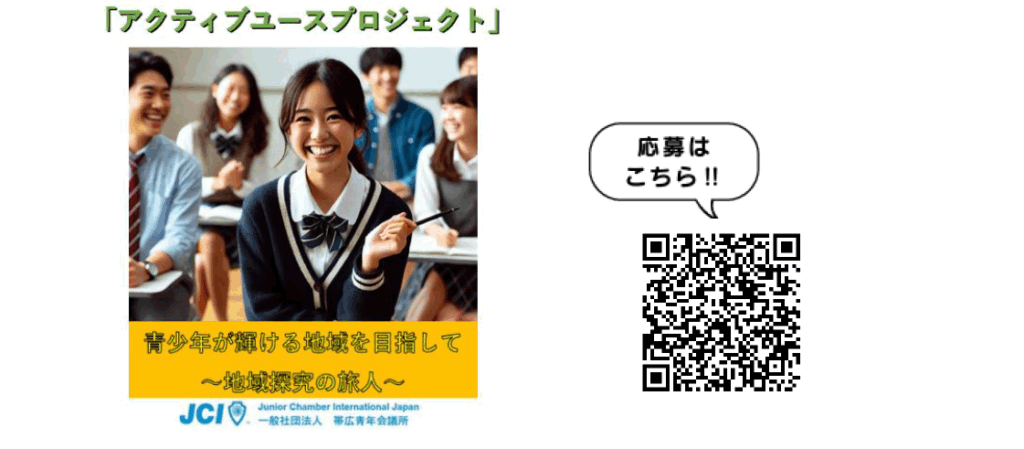 内容:「探究×地域 を通して学んだこと」アクティブユースプロジェクトやJCI JAPAN グローバルユース国連大使育成事業での経験を通して、とかちの強みと課題を知ったことや探究活動の中で自己の成長について発表してもらいます。