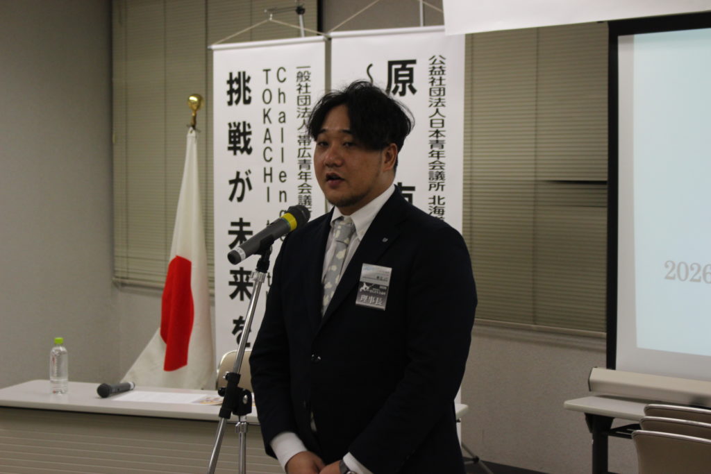 一般社団法人帯広青年会議所 理事長 梶原 成悟(かじわら せいご)君から、新入会員に向けて、青年会議所の運動と構築について講師である瀧先輩から沢山吸収していただきたい。ビジネスだけでは学べない人の気持ちを変えることこそが青年会議所の運動であり、青年会議所だけでなく自分自身の人生に活かせるツールとしてアカデミースクールを活用していただきたい!とご挨拶いただきました。