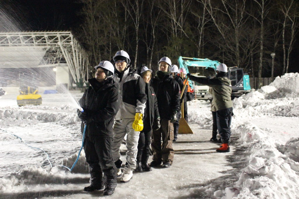 水をかけると雪が一気に柔らかくなり、後ろに続くメンバーが一列に並び、足でしっかり踏みつぶすことで表面が滑らかに固まっていく、この繰り返しが、ツルツルなリンクを生み出す秘訣です!!