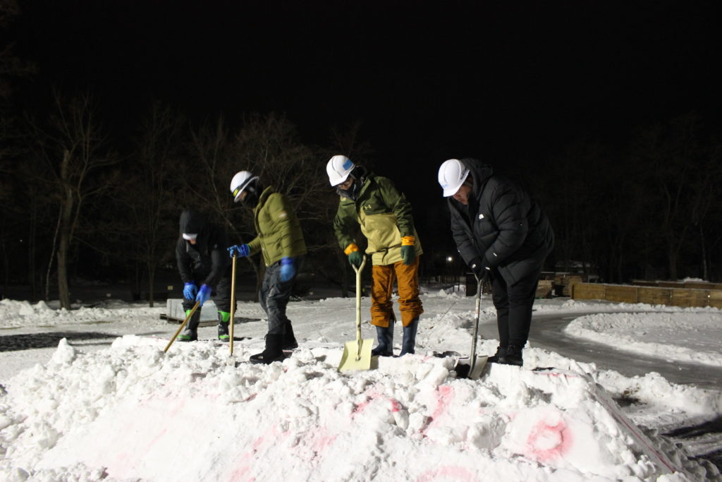 雪は硬くなっているため、力いっぱいスコップで形を整えていきます!