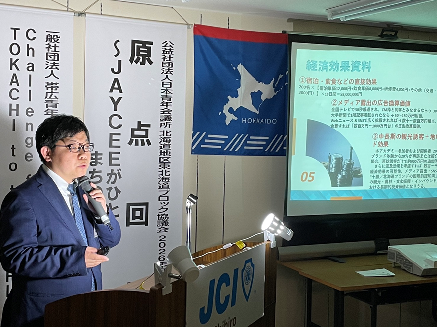 続いて、一般社団法人帯広青年会議所 副理事長、JCIアカデミー実行委員長の片岡 正太郎(かたおか しょうたろう)君より、JCIアカデミーの趣旨説明並びにプレJCIアカデミー事前説明が行われました。JCIアカデミーは世界約80か国から次年度のリーダーとなる人材が集まることや、必要な事業費の具体的な金額が示されました。「世界中に繋がりができる事業で、帯広の未来に必ずつながります。ぜひ当事者意識を持って参加してほしいです。」とお話をしていただきました。